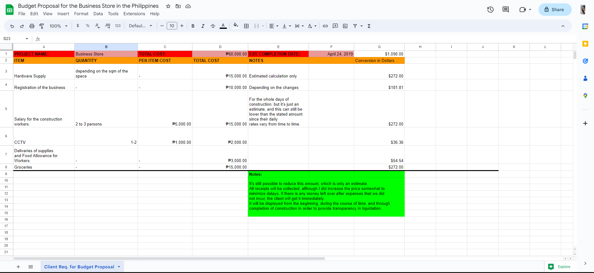 Sample work for Budget Planning