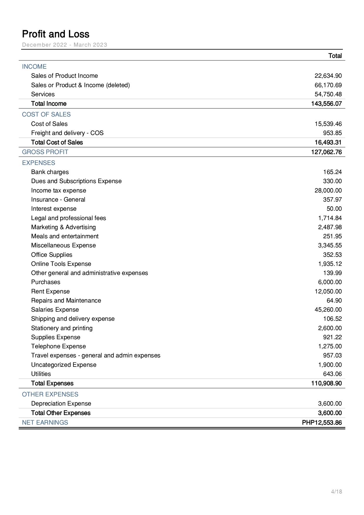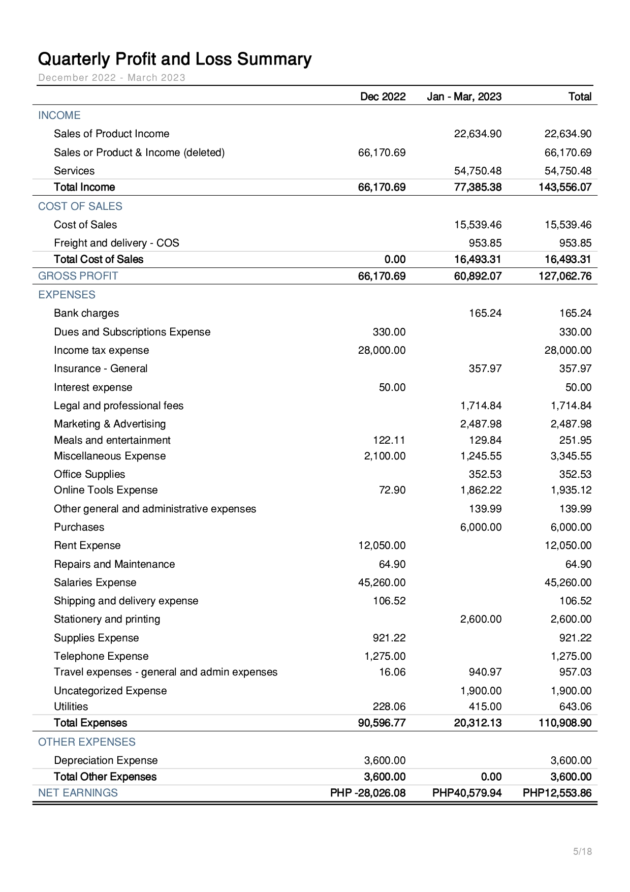 Quarterly Profit and Loss Summary Report