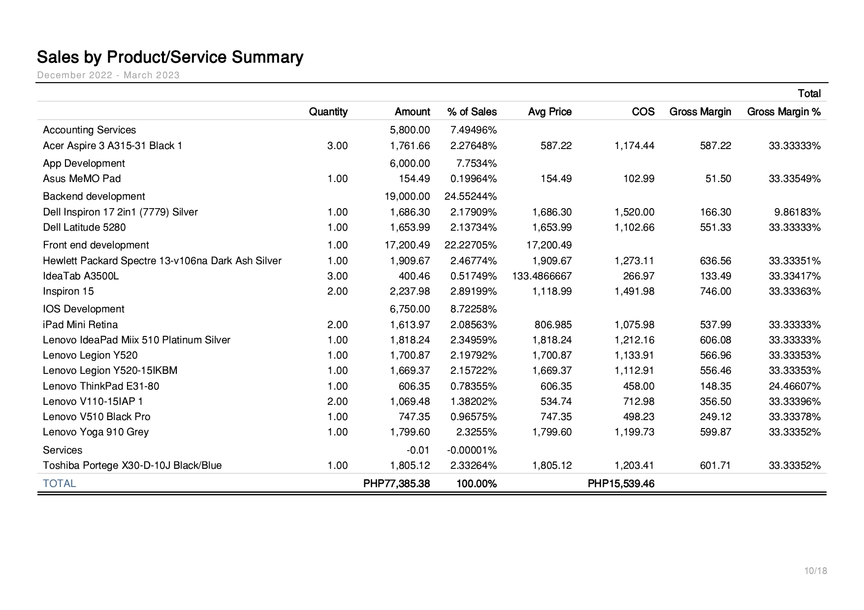 Sales by Product,Service Summary Report