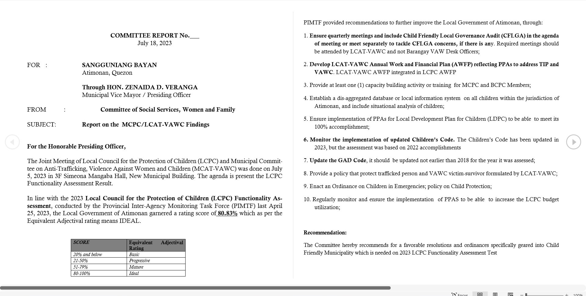 Honorable Presiding Officer, I am bringing this data to this August body to look at the current situation of women in our society. When obscene jokes are taken lightly even if women are uncomfortable receiving it, this jokes violates already the woman by sending indecent jest. And often times Honorable Presiding Officer, the victims are held liable for being abused. “Kasi gabing-gabi na eh nasa labas pa”, “ang ikli kasi ng suot kaya nangyari sa kanya yan”. “malandi kasi yan”, these are uncalled remarks that some victims receive when they decided to share their experiences. This is on top on the emotional dilemma that they are already experiencing. Based on the study conducted by PNP Atimonan the rape was triggered when the mother is absent or working outside Atimonan (OFW etc.), when the child or minor is under the care of another care-giver aside from the mother, Self-seclusion of the family, incest happened to those who live very far from the community. Also, when the girl or a woman is already comfortable to their close relatives and they fully trust them.