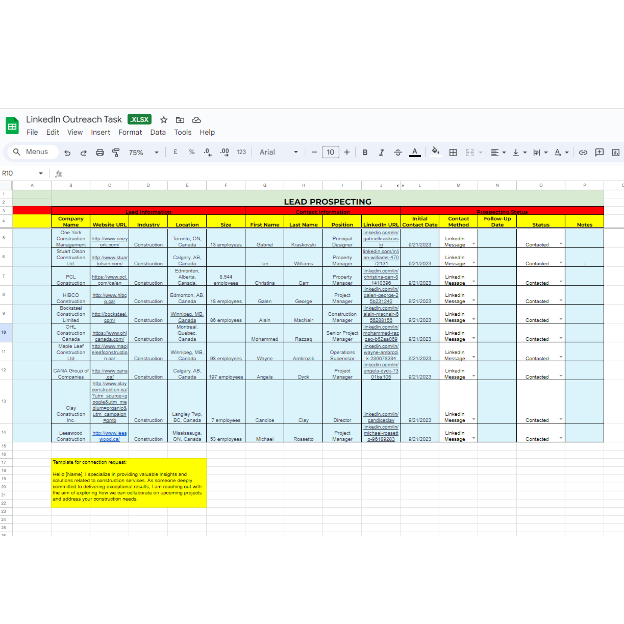 Objective: Generate 10 leads for a construction company in Canada. Start by identifying potential clients such as developers, property managers, and architects. Offer to provide them with valuable insights or solutions related to construction services. Initiate conversations about their upcoming projects and construction needs.