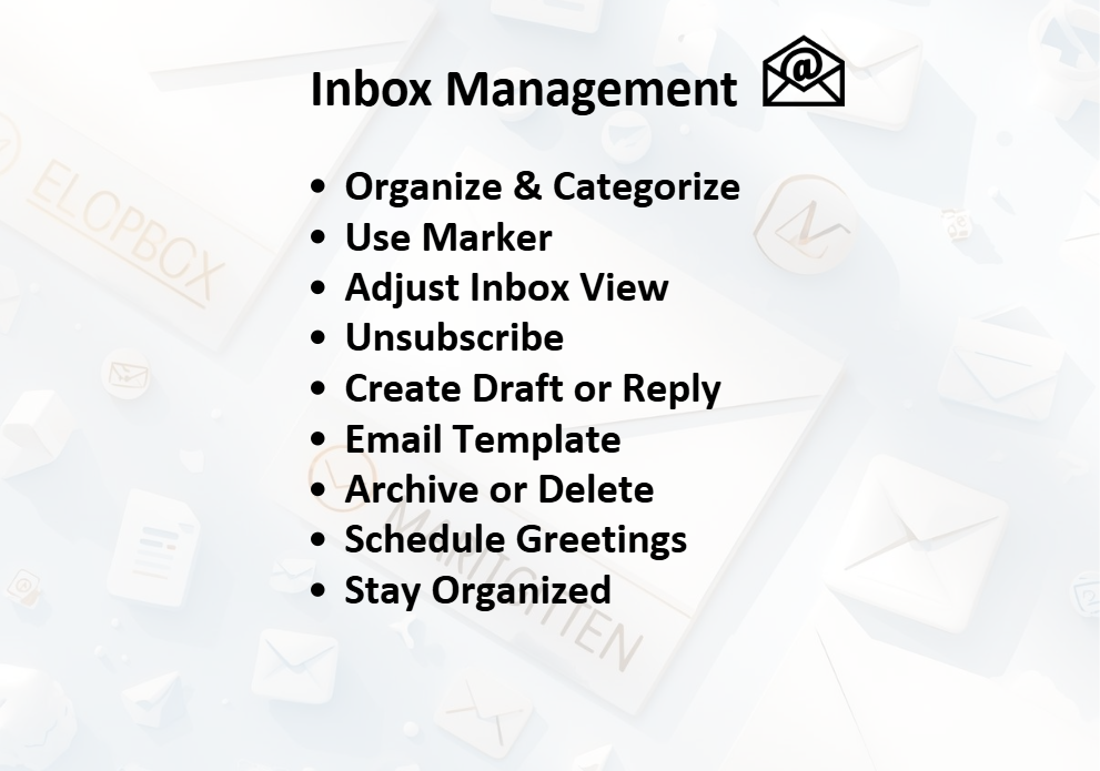 Efficiently organizes, monitors, and responds to emails to ensure timely communication. This includes sorting messages, flagging priorities, drafting replies, unsubscribing from spam, maintaining a clean inbox, and ensuring no important message is missed.