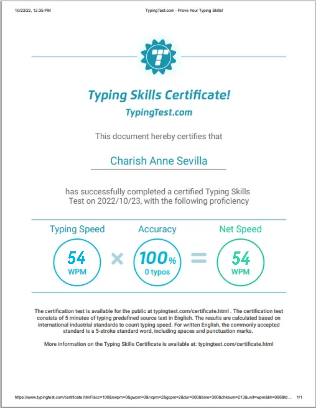 Typing Test Certificate