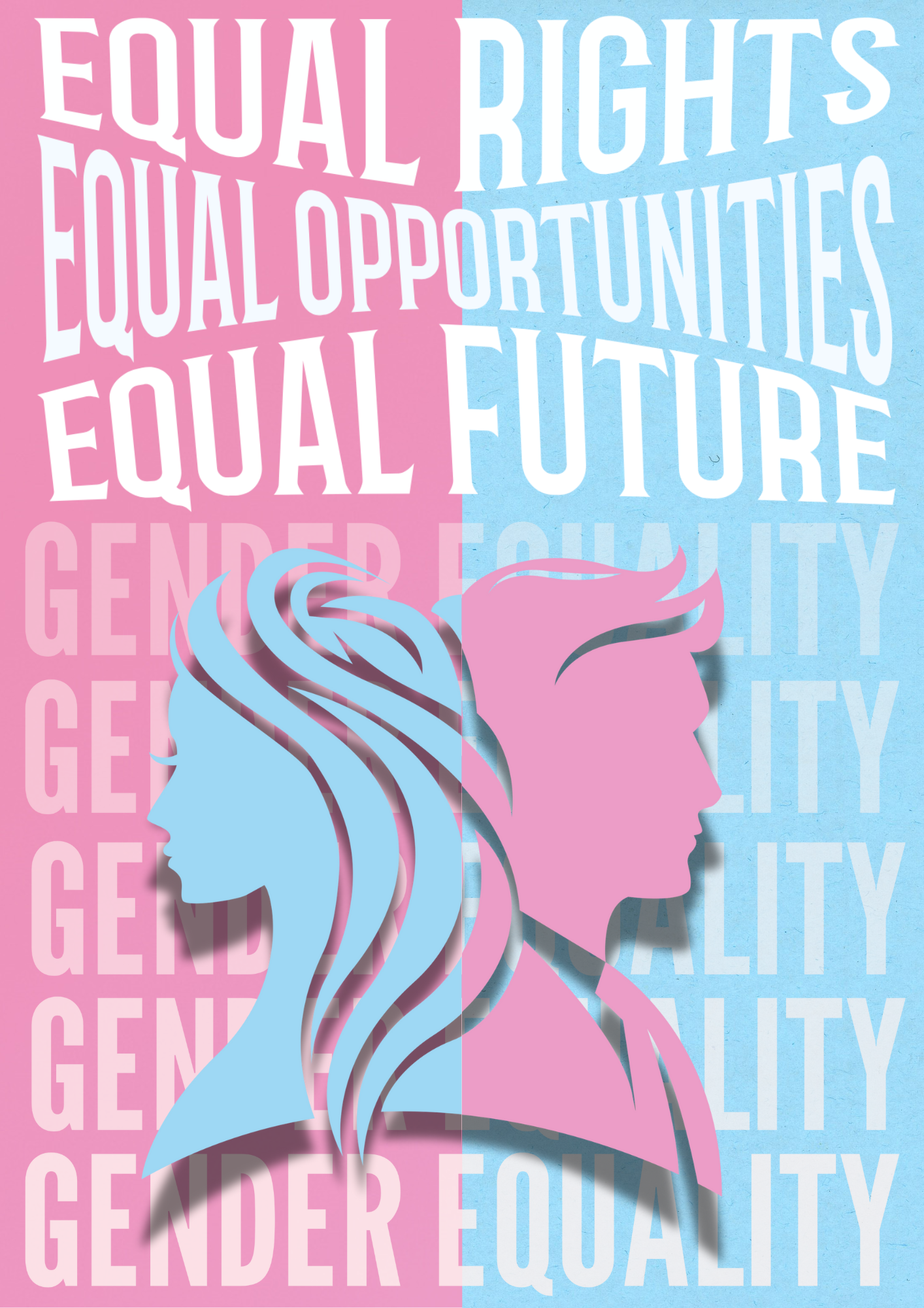 This image is a powerful visual representation of gender equality. The design is split into two sections, with the left side in pink and the right side in blue, symbolizing the traditional colors associated with femininity and masculinity. In the center, there are silhouettes of a female and male profile facing opposite directions, emphasizing the idea of balance and equality between genders.