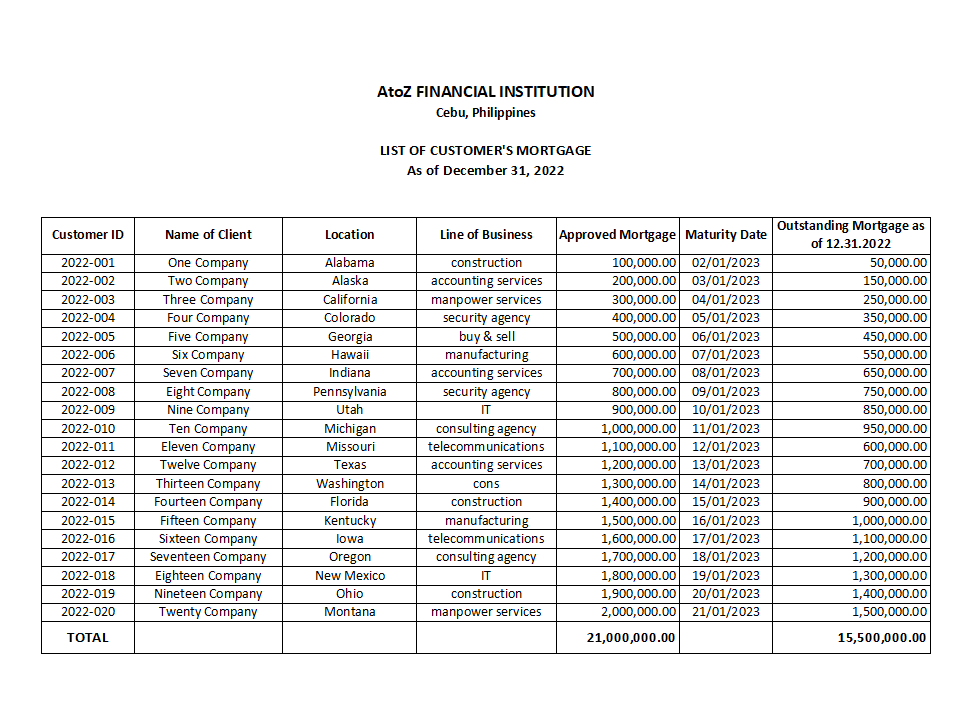 Sample Wok on Data Entry : List of Customers' Mortgage