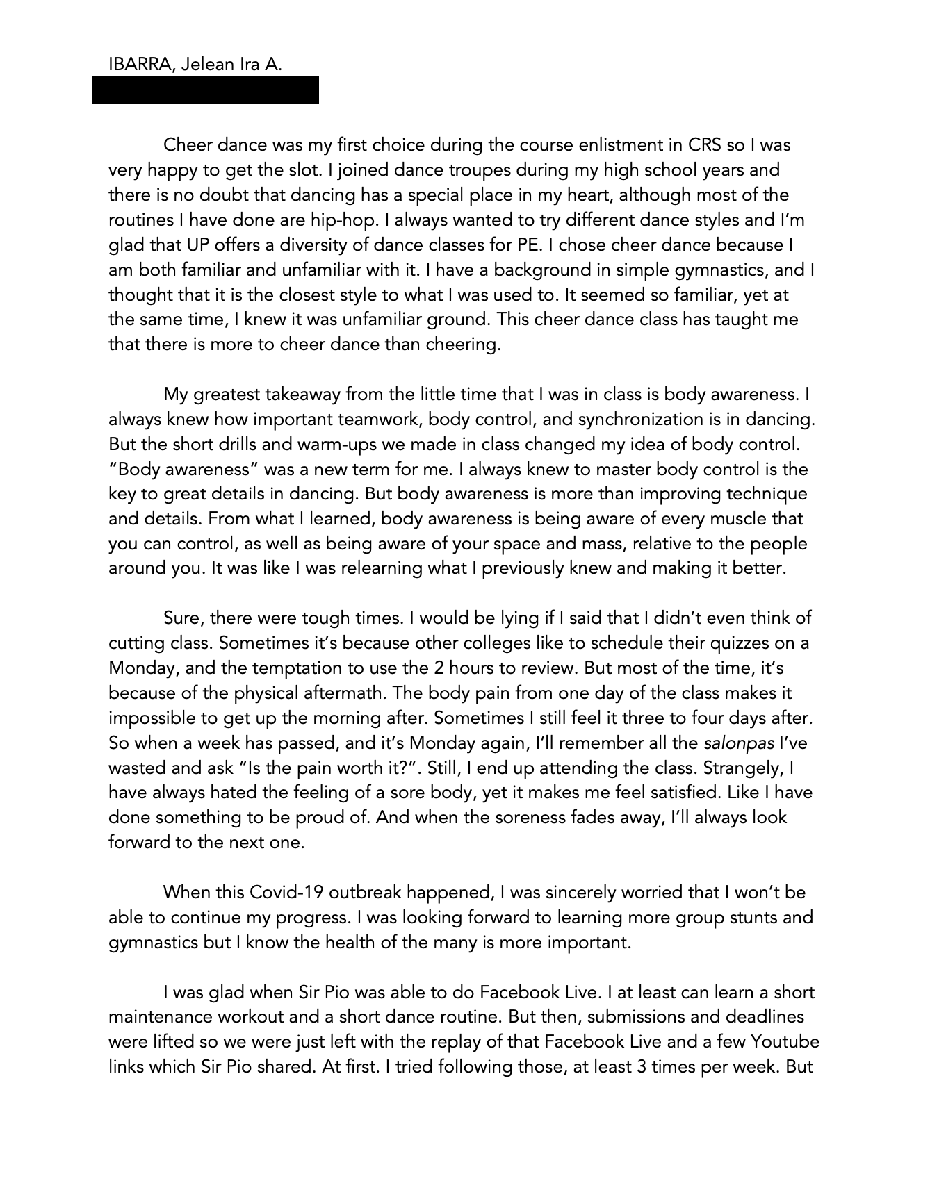 Cheer dance was my first choice during the course enlistment in CRS so I was very happy to get the slot. I joined dance troupes during my high school years and there is no doubt that dancing has a special place in my heart, although most of the routines I have done are hip-hop. I always wanted to try different dance styles and I’m glad that UP offers a diversity of dance classes for PE. I chose cheer dance because I am both familiar and unfamiliar with it. I have a background in simple gymnastics, and I thought that it is the closest style to what I was used to. It seemed so familiar, yet at the same time, I knew it was unfamiliar ground. This cheer dance class has taught me that there is more to cheer dance than cheering.