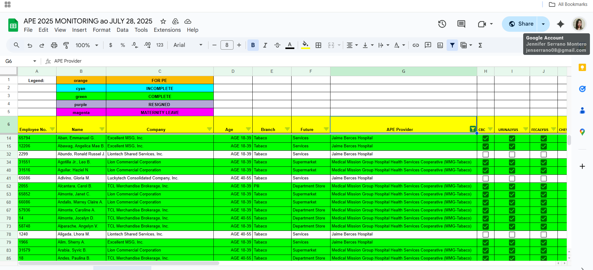 This is a google spreadsheet for employees' Annual Physical Exam results were recorded, a monitoring sheet as well to identify employees who complied, and those who are non-compliant.