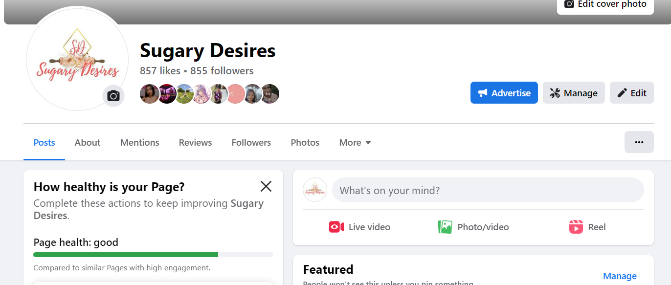 Sugary Desire's Facebook Page with 855 organic followers