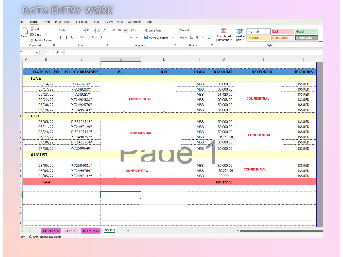 In my previous job, fact-finding and collecting relevant data from our client was one of my crucial works as a financial advisor. Through the use of Microsoft Excel, it is very helpful for me in terms of making my daily production reports which I really needed. The above table shows the Issue date, policy number and names of the accounts I booked and issued; the chosen plan and its corresponding amount; and the list of names of the bank partners or referrers. I always make sure that the report I make was correct and accurate for me to be able submit my reports efficiently in timely manner.
