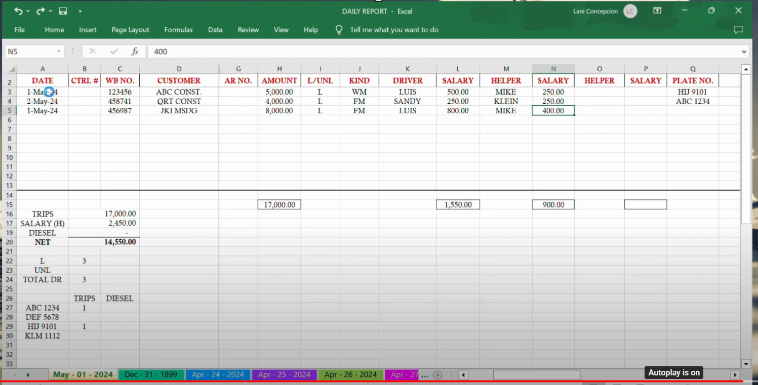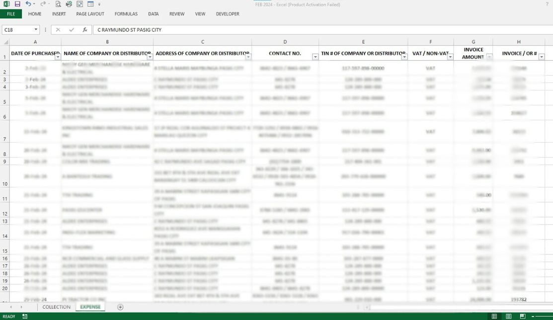 This example demonstrates my proficiency in accurately recording receipt data in a structured table format. The table includes critical information such as the date, company name, address, contact number, TIN, and amount. This task highlights my attention to detail and ability to manage financial data efficiently.