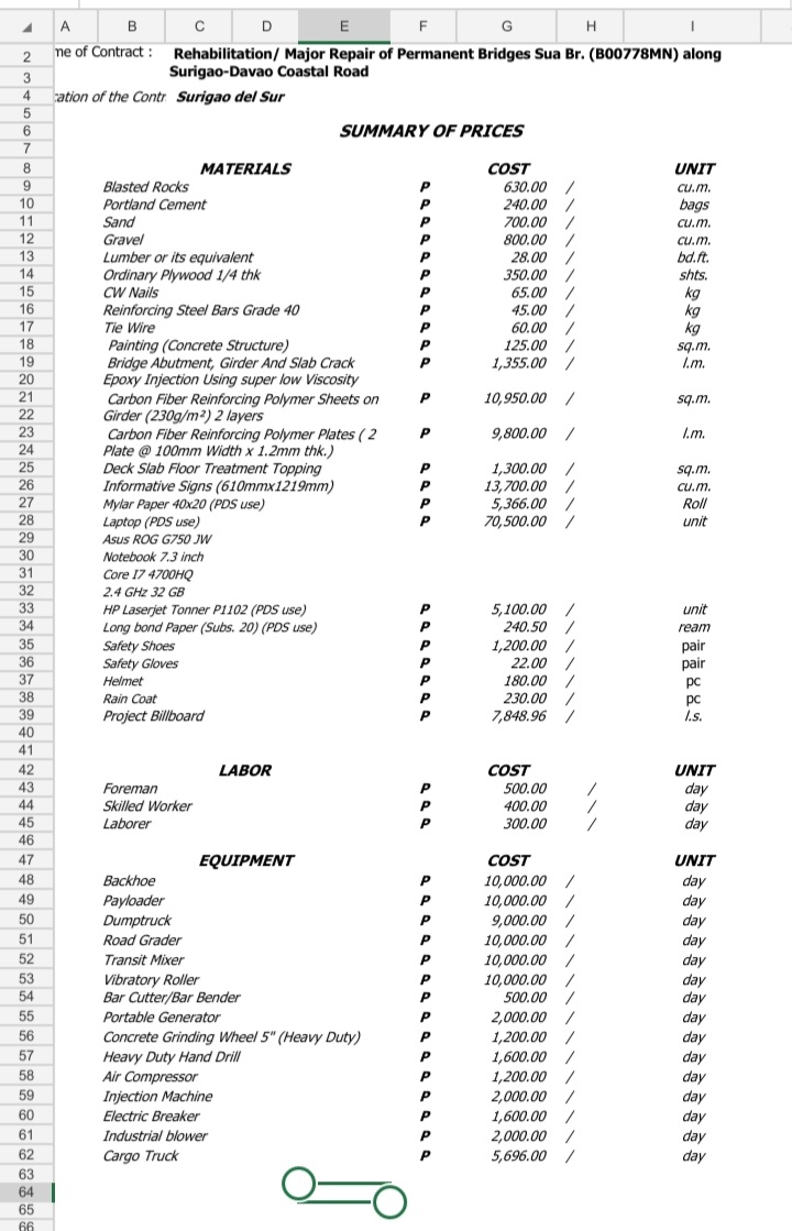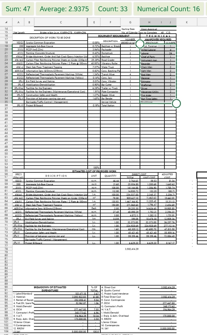 Summary of prices in the project contract using Microsoft Excel