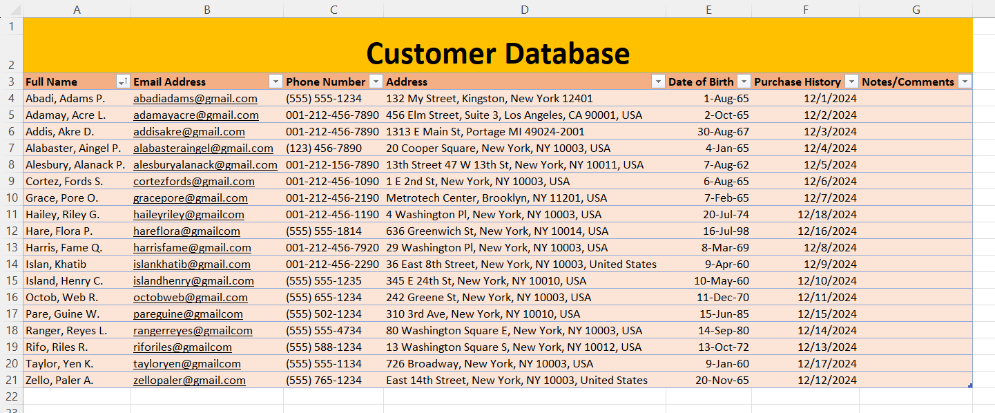 Objective: Create a customer database using Google Sheets. This database will help the company manage customer information effectively.