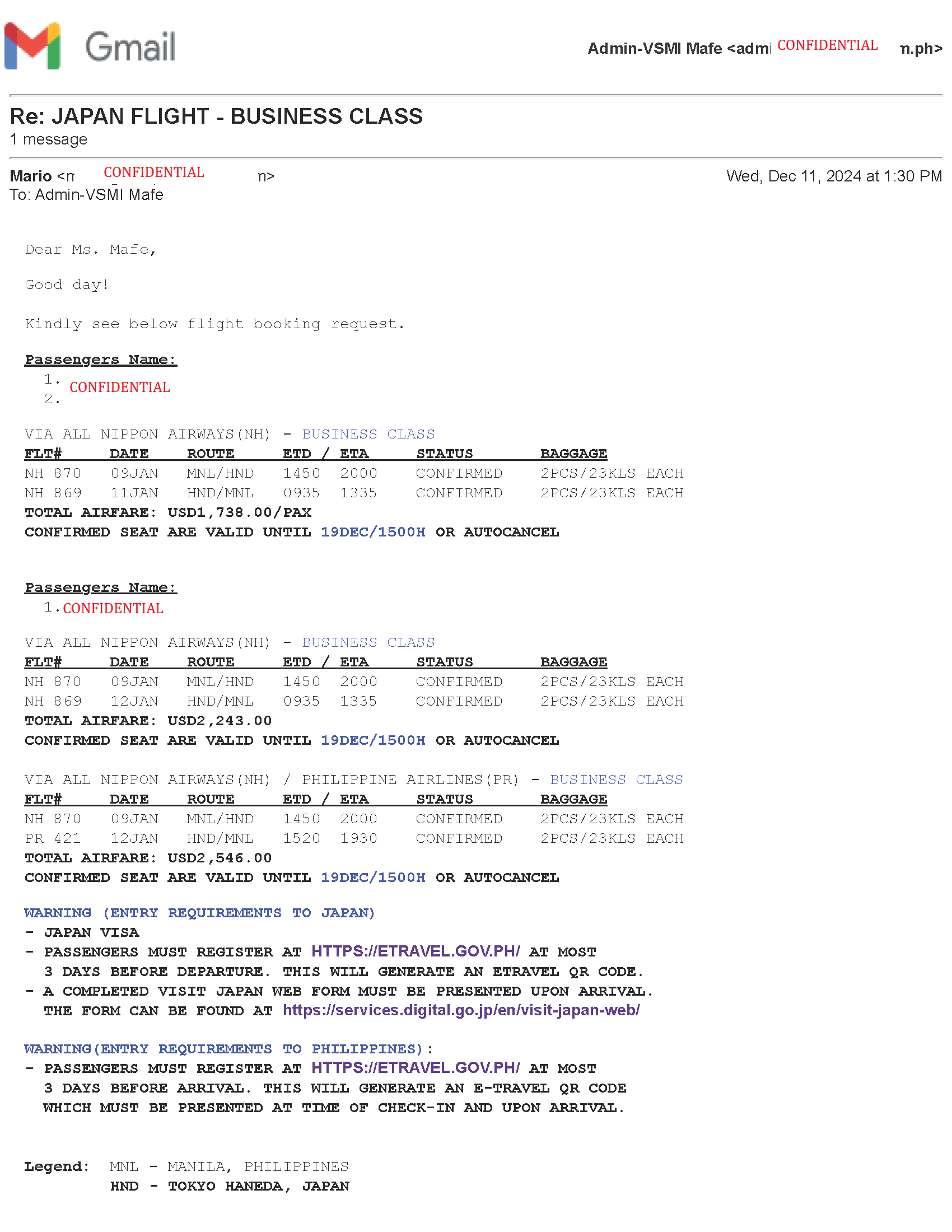 Japan Flight Booking arrangement - Business class
