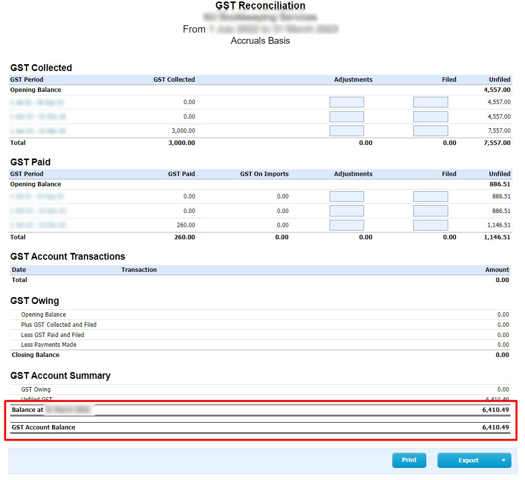 Bookkeeping Xero GST Comparison Sample