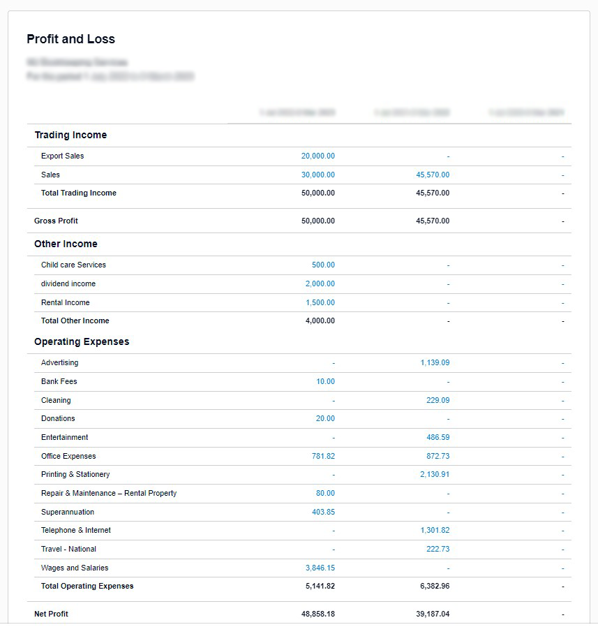 Bookkeeping Xero Profit and Loss Sample