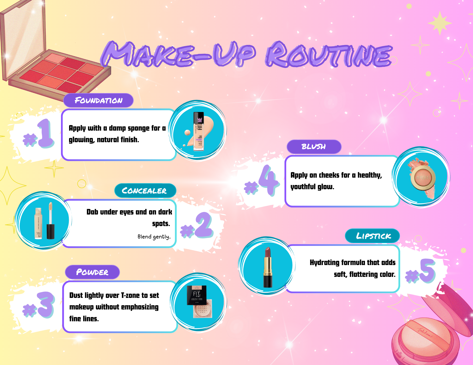 A playful and engaging visual guide illustrating a basic make-up routine. Designed for beginners, the layout combines vibrant gradients, cute icons, and product mockups to make skincare steps easy to follow and aesthetically appealing.