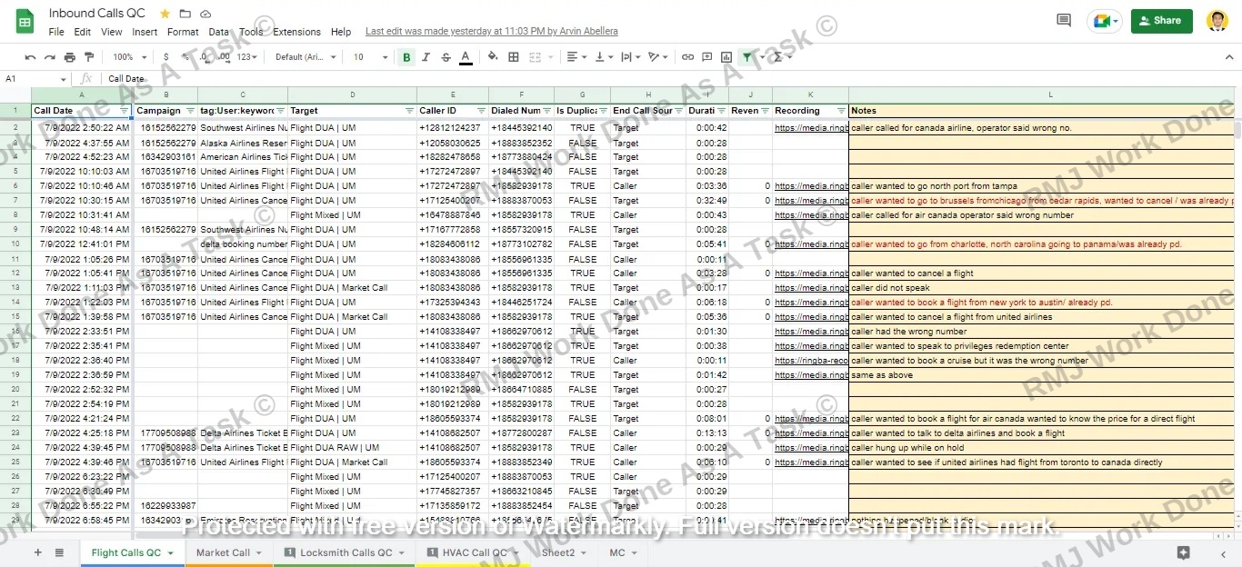 The project is focused on transcribing recorded audio calls of inbound flights, market, locksmith, and HVAC calls. As a data entry specialist, you will be responsible for transcribing the audio recordings into written text, and then inputting it into a database or spreadsheet.