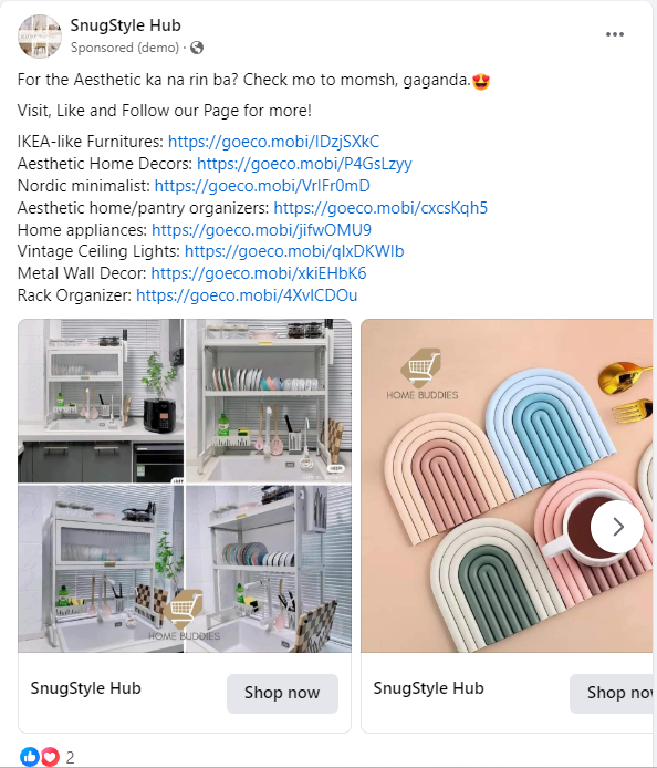 I used the creatives from the product display on the website and made a carousel with a CTA of SHOP now.