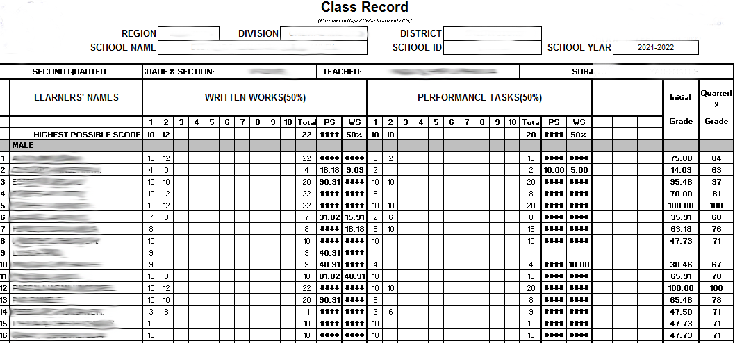 Data Entry Sample Works (Grades of Students)
